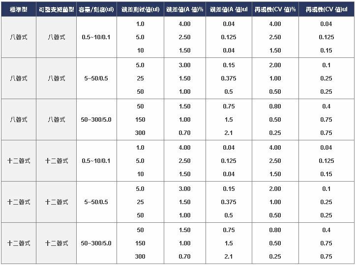 • 各種容量的8管式微量吸管適用於標準96孔培養盤